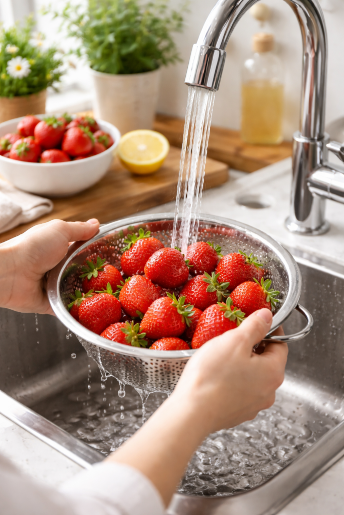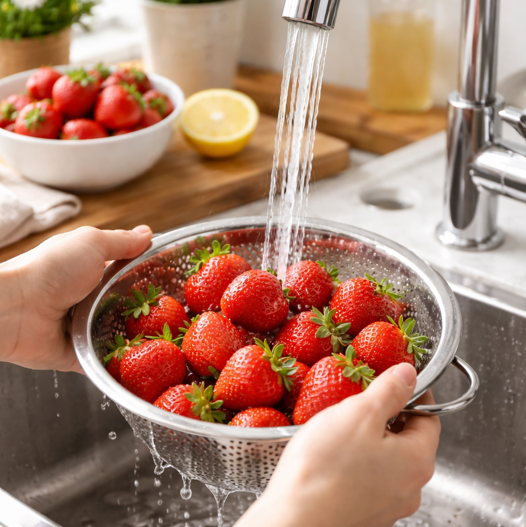딸기는 100g당 비타민C 함량이 60~70mg으로 과일 중에서도 높은 수준이다. 비타민C는 물에 잘 녹고 열에 약해 관리가 중요하다. 딸기 세척 전 꼭지를 먼저 떼는 사람들도 있는데, 이 경우 절단면을 통해 비타민이 물로 빠져나가기 쉽다. 흐르는 물에 오래 씻을수록 손실도 커진다. 반드시 꼭지를 붙인 상태로 빠르게 씻은 뒤 먹기 직전에 제거하는 것이 좋다.